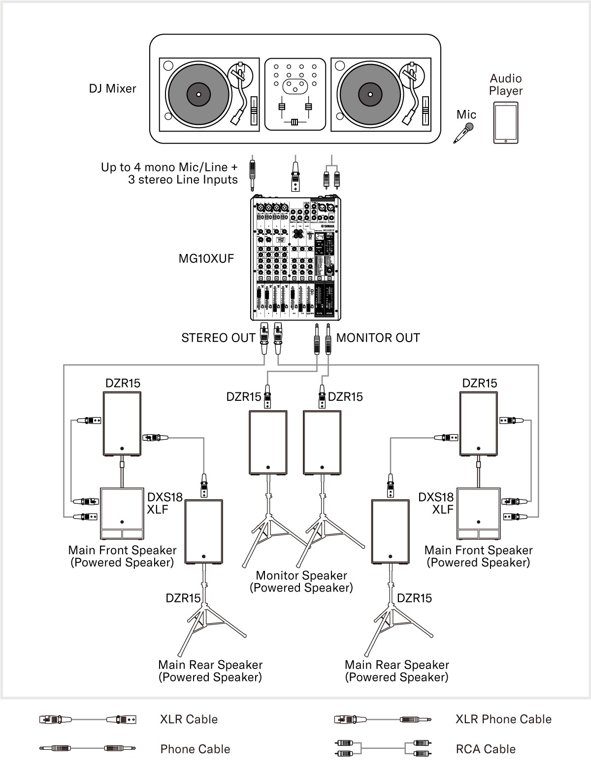 Với cách thiết lập này hệ thống âm thanh biểu diễn di động sẽ vô cùng mạnh mẽ, thân thiện với người dùng, với công suất đầu ra tạo nên những buổi tiệc âm nhạc rõ ràng , tràn đầy năng lượng cho các bữa tiệc ngoài trời quy mô trung bình / hay sự kiện DJ, v.v. cho khán giả lên đến 100 người tùy thuộc vào kích thước chỗ ngồi / địa điểm.