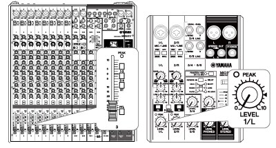 Các nút điều chỉnh này điều chỉnh âm lượng của từng kênh, group, đường output stereo, v.v. Một số mixer sẽ sử dụng bộ điều khiển dạng fader (thanh trượt). Mặc dù nút vặn điều khiển cho phép thao tác nhanh chóng hơn.