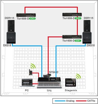 Users wishing to expand on the TF's already extensive input/output capability can easily add up to 3 units with the optional NY64-D expansion card and Tio1608-D I/O racks. Daisy-chaining the main console offstage and Tio1608-D I/O racks on stage using lightweight CAT5e Ethernet cables allows low-latency, high-quality sound transmission without the time-consuming transport and setup of bulky analog snakes.