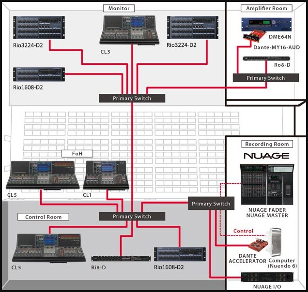 Hệ thống sản xuất âm thanh tiên tiến Nuage có thể kết hợp với hệ thống live sound của mixer CL và những dòng rack I/O Rio qua hệ thống mạng Dante. Điều đó có thể tạo nên một hệ thống âm thanh đồng nhất có thể hoạt động cùng lúc cho live sound và production trong những phòng thu của hội trường hay nhà hát. Bởi vì chức năng Gain Compensation có thể được áp dụng khi các bộ rack I/O Rio được sử dụng với bàn mixer CL, việc điều chỉnh gain analog từ nhiều mixer CL được kết nối sẽ không gây ra những thay đổi ngoài mong muốn cho tổng âm lượng.