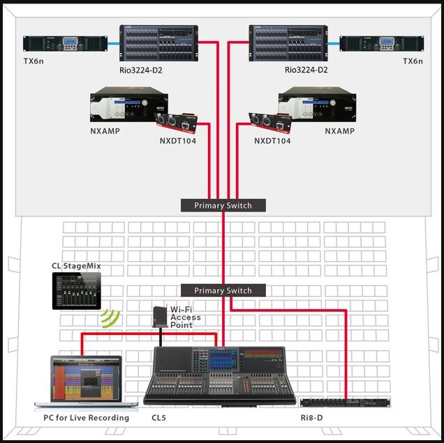 Những cổng switch trên mixer cho phép những mixer CL có thể được thiết lập dễ dàng cho các cấu hình mạng daisy-chain hoặc star. Trong ví dụ này, mixer ở vị trí FOH được kết nối trực tiếp với bộ I/O rack ở bên cạnh sân khấu. Hệ thống mạng ở chế độ self-configured. Dĩ nhiên ứng dụng iPad CL StageMix cũng có thể được sử dụng trong những hệ thống đơn giản như thế này, và Dante Virtual Soundcard có thể được dùng cho việc thu âm multitrack vào software máy tính như Steinberg’s Nuendo.