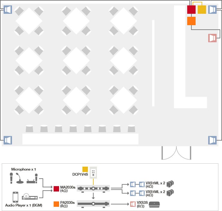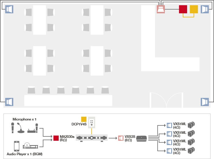 Đây là hệ thống kết nối VXS3S với trở kháng cao và xây dựng nhiều satellite. Bạn có thể dễ dàng thay đổi âm lượng cần thiết bằng cách chuyển đổi giá trị W output. MA2120 có thể cung cấp các nguồn khác nhau ở các âm lượng khác nhau trong khu vực tương ứng.