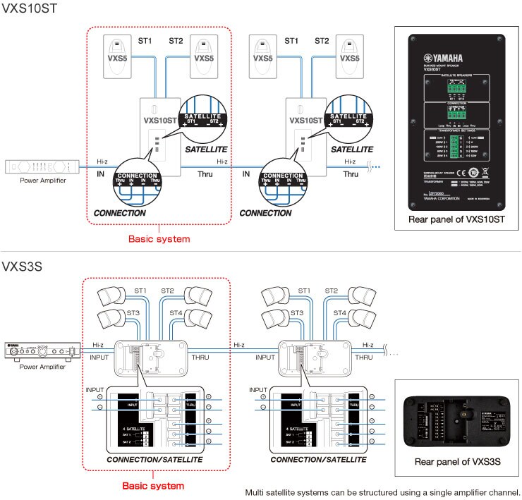 VXS3S và VXS10S/VXS10ST có đầu nối satellite ở bảng phía sau, giảm thiểu số lượng kênh amplifier khi lắp đặt vào hệ thống hoạt động. Nhờ VXS3S và VXS10ST đều hỗ trợ các kết nối trở kháng cao, nên người dùng có thể kết nối trở kháng thấp với các loa satellite trong khi loa siêu trầm được kết nối với một hệ thống trở kháng cao. Loa satellite được tích hợp high-pass filter mang đến sự giao thoa tần số tự nhiên, mượt mà đặc biệt từ loa siêu trầm đến loa satellite.