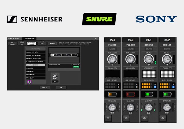 Với phần mềm phiên bản V5.0 trở lên, bàn mixer RIVAGE PM hỗ trợ điều khiển và monitor các đầu thu không dây phổ biến trên thị trường, mang lại cho bạn sự tiện lợi khi vận hành các hệ thống âm thanh này.