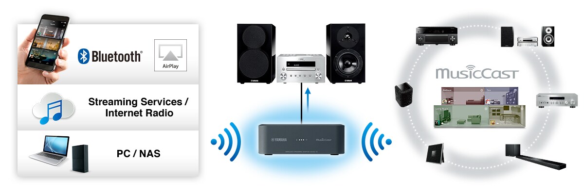 MusicCast là một cuộc cách mạng mới về âm thanh mạng, sử dụng tất cả các sản phẩm MusicCast của bạn cùng nhau hoặc riêng biệt, điều đó hoàn toàn tùy thuộc vào bạn. Kiểm soát dễ dàng với một ứng dụng, được thiết kế trực quan, nhanh chóng và đơn giản để sử dụng. Sử dụng soundbar, loa không dây, AV Receiver, âm thanh HiFi. Tùy theo loại nào phù hợp nhất, phối hợp và chọn thiết bị mở rộng hệ thống MusicCast của bạn. Những sản phẩm hoàn toàn mới từ Yamaha, hệ thống MusicCast mang mọi thứ đến mọi nơi cho mọi người.