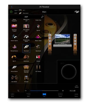 Bạn có thể điều khiển bật/tắt nguồn và tăng/giảm/tắt âm lượng. Ứng dụng hiển thị đầu vào, chế độ DSP và vùng nào được chọn. Âm lượng quay đảm bảo điều khiển âm lượng thuận tiện hơn.