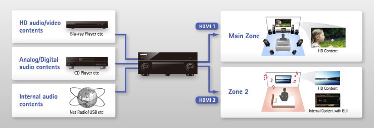 Trong khi bộ chuyển vùng HDMI tiêu chuẩn chỉ có thể gửi các chương trình video HD đến vùng chính hoặc vùng thứ hai, bộ chuyển đổi vùng HDMI của Yamaha có thể chọn từ tất cả nguồn audio và video để phát lại trong bất kỳ vùng nào. Một giao diện người dùng đồ họa trên màn hình giúp dễ dàng duyệt và chọn nội dung để thưởng thức từ vùng thứ hai bất kể đang phát gì trong vùng chính.