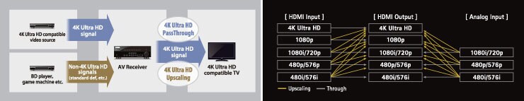 This AV receiver's HDMI input / output supports 4K Ultra HD video image pass-through. It also can perform 4K Ultra HD upscaling to boost a lower resolution image to super high-def resolution. This ensures compatibility with the latest super high resolution video formats. The latest version of HDMI supports 4K 50 / 60p input for expanding super high definition resolution 4K broadcasting.