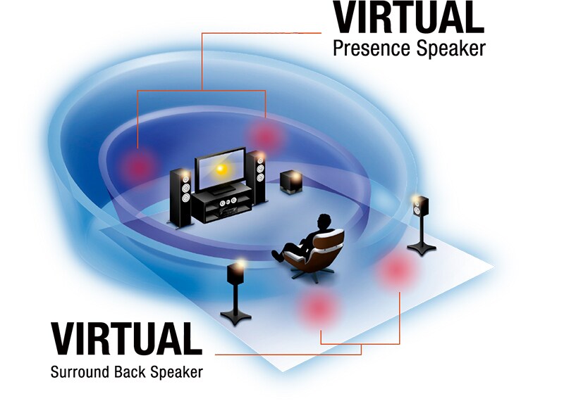 With the power of CINEMA DSP 3D, the Virtual Presence Speaker function makes full use of centre and surround speakers to create audible information from where presence (height) speakers are normally installed. In addition, this model also features a Virtual Surround Back Speaker function. Even without using surround back speakers, you can experience more natural surround sound thanks to CINEMA DSP 3D playback — giving you the virtual equivalent of up to 9.1-channel surround, even with a 5.1-speaker configuration.