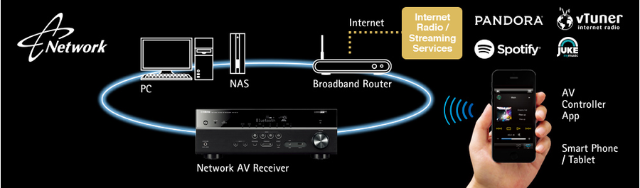 Bộ thu AV này cung cấp các chức năng mạng khác nhau giúp bạn có thể truy cập nhiều nguồn và cải thiện hoạt động. Bạn có thể kết nối bộ thu này với PC để thưởng thức Internet Radio và điều hành hệ thống của bạn qua Web Browser Control. Ứng dụng AV Controller (từ iTunes App Store hoặc Google play) để bạn kiểm soát các chức năng khác nhau từ iPod, iPhone, iPad hoặc máy tính bảng/điện thoại Android.