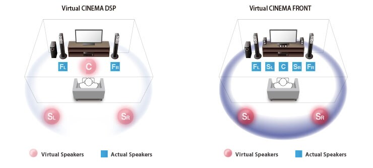 • Virtual CINEMA FRONT cung cấp âm thanh vòm với 5 loa phía trước