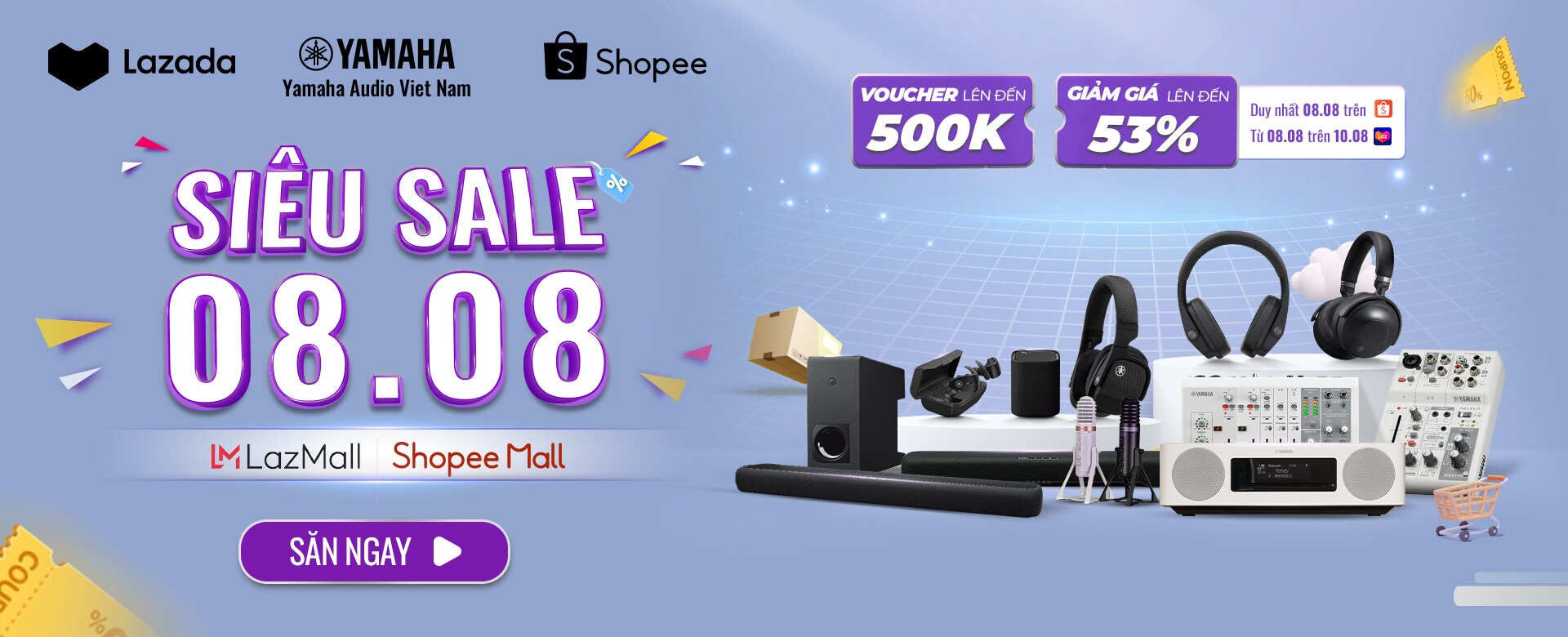 Tiếp nối chương trình ưu đãi cho mùa hè thêm sôi động, Yamaha Audio gửi đến bạn loạt ưu đãi lên đến 53%, cùng voucher lên đến 500,000 khi mua sắm ở gian hàng chính hãng tại ứng dụng Shopee và Lazada.