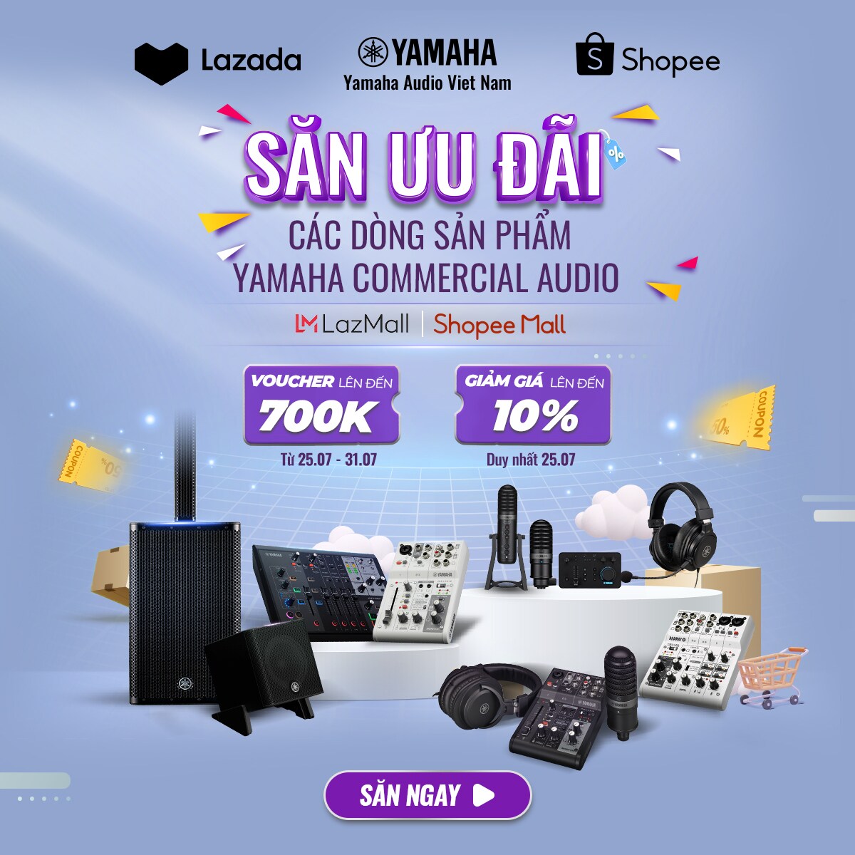 Mùa hè rực lửa, nay càng thêm hấp dẫn với loạt ưu đãi độc quyền của Yamaha Audio áp dụng khi mua hàng tại kênh Shopee và Lazada. Nhanh tay truy cập vào ứng dụng, bỏ giỏ hàng và ghi nhớ thời gian áp dụng voucher chi tiết dưới đây: