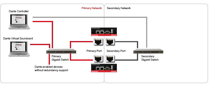 - Các thẻ Dante-MY16-AUD2 có thể được kết nối theo chuỗi daisy chain qua cổng Ethernet phụ.