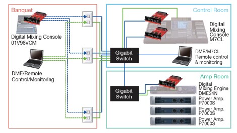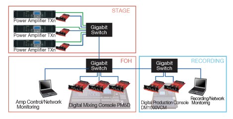 Trong sơ đồ này, bàn trộn âm thanh Yamaha LS9 đóng vai trò là bộ điều khiển HA Remote. Bàn trộn được kết nối qua cổng Ethernet chính của thẻ Dante-MY16-AUD đã cài đặt đến một switch mạng. Thẻ Dante-MY16-AUD được thiết lập ở chế độ HA Remote Mode 2 thông qua Dante Controller. (Để biết chi tiết, vui lòng tham khảo Hướng dẫn sử dụng Dante-MY16-AUD phiên bản 1.23).