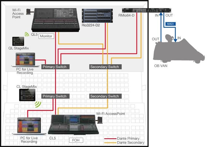 Thiết bị RMio64-D chuyển đổi tín hiệu Dante trong hệ thống thành tín hiệu MADI để truyền đến những xe màu ở bên ngoài khu vực sân khấu. Chức năng chuyển đổi sample rate tích hợp bên trong RMio64-D giải quyết hiệu quả các vấn đề đồng bộ word clock.