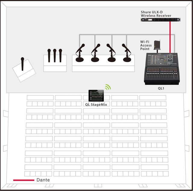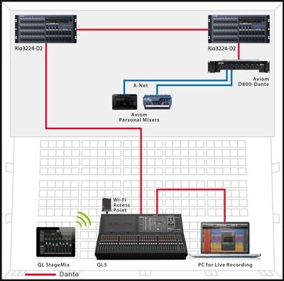 Đây là ví dụ của một hệ thống live đơn giản sử dụng hệ thống mạng Dante. Bộ rack I/O dòng R ở bên cạnh sân khấu được kết nối với mixer FoH QL thông qua dây cáp mạng. Một hệ thống monitor cá nhân Aviom cũng có thể được kết nối tới mạng Dante qua thiết bị Aviom D800-Dante. Thiết lập này thậm chí cho phép thu âm multitrack vào máy vi tính thông qua mạng Dante.
