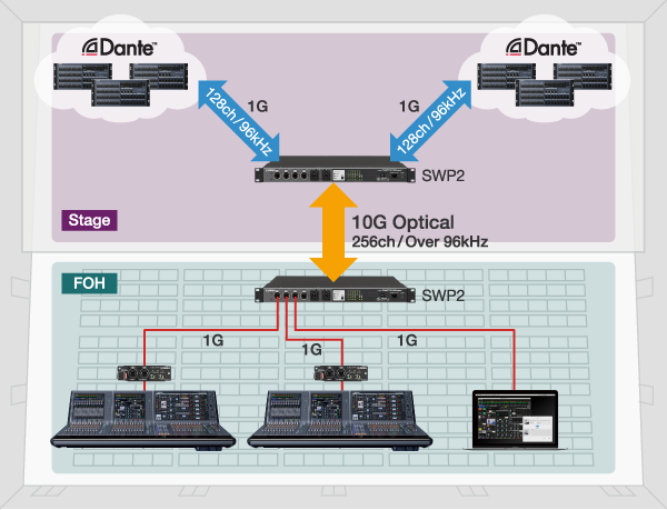 Dòng SWP2 được trang bị cổng quang uplink 10G, cho phép vận hành mà không lo ngại về băng thông ngay cả trên mạng Dante được thiết lập ở tần số lấy mẫu 96kHz. Đây là một giải pháp linh hoạt, có khả năng mở rộng theo sự phát triển của hệ thống mạng Dante 96kHz với số lượng kênh lớn.