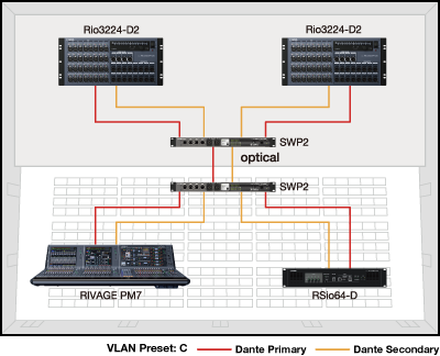 Trong ví dụ này, Cấu hình đặt trước VLAN C đã được thiết lập trên các bộ chuyển đổi mạng dòng SWP2, với đường chính Dante được gán cho VLAN1 và đường phụ được gán cho VLAN2. Chỉ cần hai bộ chuyển đổi mạng cho các kết nối cáp dự phòng.