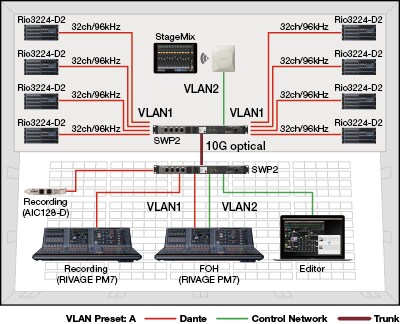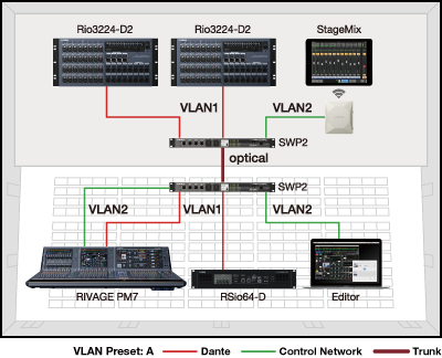 Trong trường hợp này, Cấu hình đặt trước VLAN A được sử dụng, trong đó VLAN1 xử lý mạng Dante, còn VLAN2 dành cho tín hiệu điều khiển như cho Editor hoặc StageMix từ tín hiệu âm thanh của Dante, giúp mạng ổn định hơn.