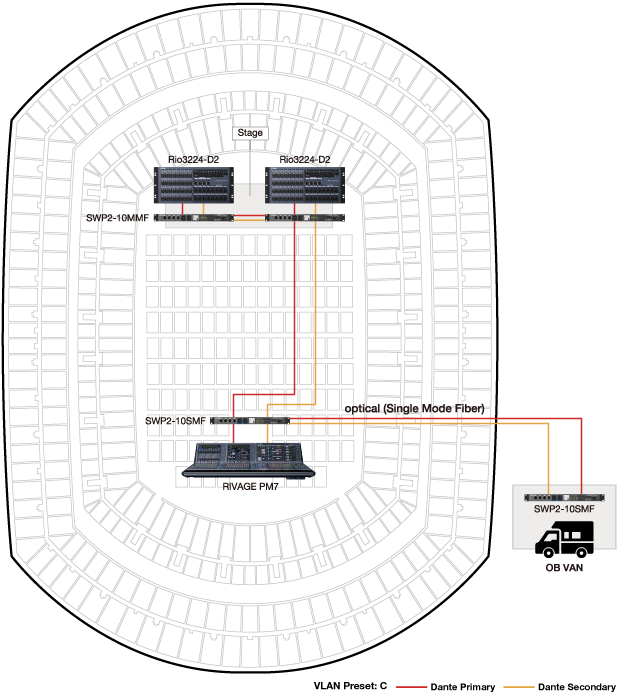 Trong ví dụ này, Cấu hình đặt trước VLAN C đã được thiết lập trên các bộ chuyển đổi mạng dòng SWP2-MMF và SWP2-SMF, với đường chính Dante được gán cho VLAN1 và đường phụ được gán cho VLAN2. Kết nối cáp quang một chế độ giữa các bộ chuyển đổi mạng cho phép truyền dữ liệu đáng tin cậy trong khoảng cách lên tới 10 kilomét.
