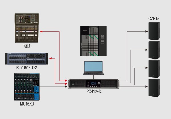 Âm thanh được đưa từ các đầu vào Dante trên hai thiết bị vào PC412-DI. Chức năng ma trận đầu vào được sử dụng để định tuyến âm thanh đã trộn đến loa. Ngoài ra, Dante Out có thể được dùng để gửi âm thanh với EQ đã điều chỉnh đến các bộ khuếch đại công suất khác.