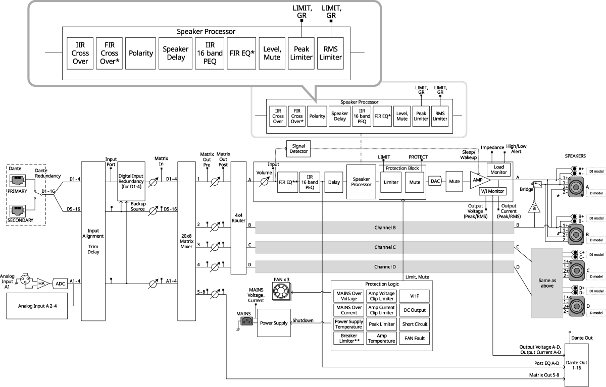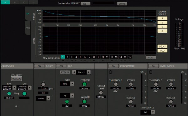 - Bộ xử lý loa bao gồm 16-band PEQ, crossover, bộ lọc, delay và limiter