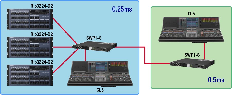 Chọn cài đặt độ trễ phù hợp dựa trên số lượng bộ chuyển mạch (hops) đến thiết bị xa nhất, bao gồm cả các switch nội bộ của dòng CL/QL/R. Nếu độ trễ được thiết lập quá thấp, âm thanh có thể bị méo hoặc gián đoạn.