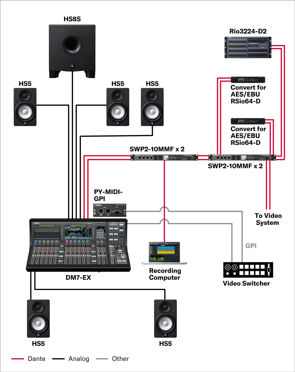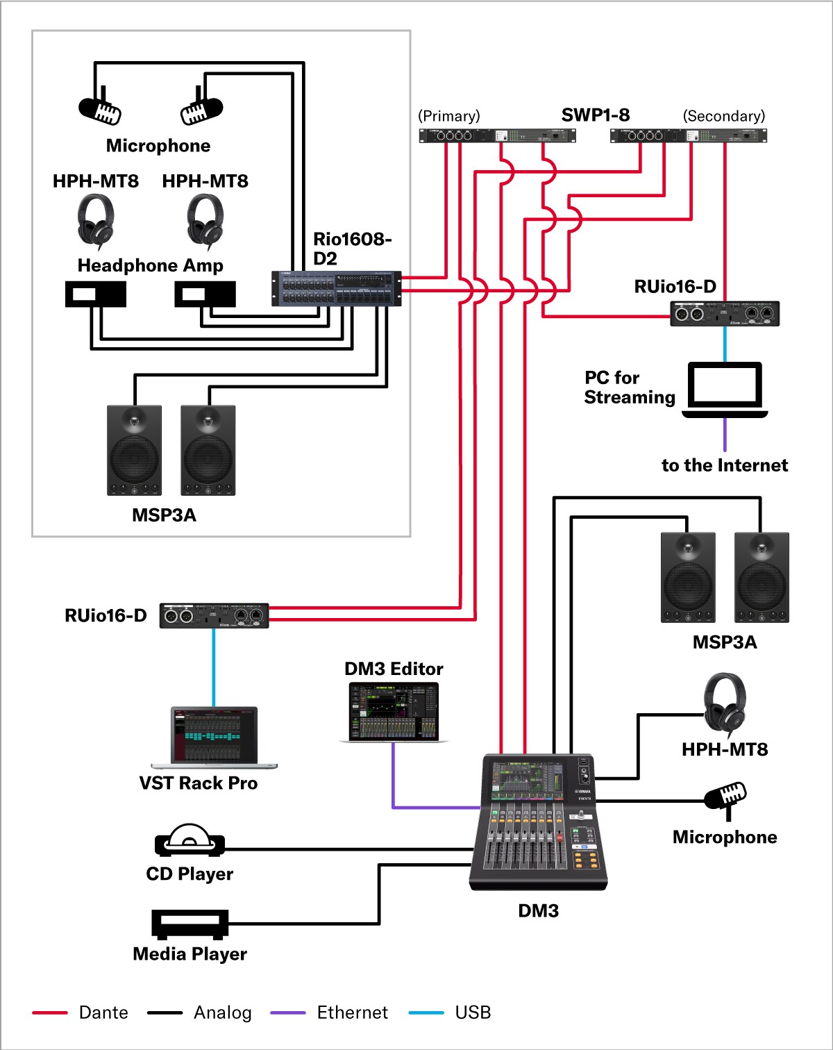 Đây là một phòng thu chủ yếu được sử dụng để ghi hình và phát sóng các chương trình talkshow, giống như một phòng thu radio. Bàn mixer kỹ thuật số nhỏ gọn DM3 được trang bị đầy đủ các cổng đầu vào và đầu ra. Bạn có thể xây dựng một hệ thống linh hoạt và dễ mở rộng xoay quanh DM3 bằng cách kết nối với các thiết bị xung quanh thông qua mạng âm thanh Dante.
