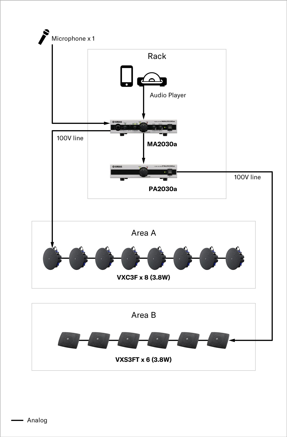 Khi một khu vực được chia thành hai vùng, có thể thực hiện cài đặt âm lượng riêng biệt cho từng vùng bằng cách tắt liên kết âm lượng giữa bộ khuếch đại công suất MA2030A và bộ khuếch đại mở rộng PA2030A. Điều này cho phép khách hàng nghe nhạc nền với âm lượng tối ưu cả trong một căn phòng yên tĩnh và trong một khu vực ồn ào như sân thượng.