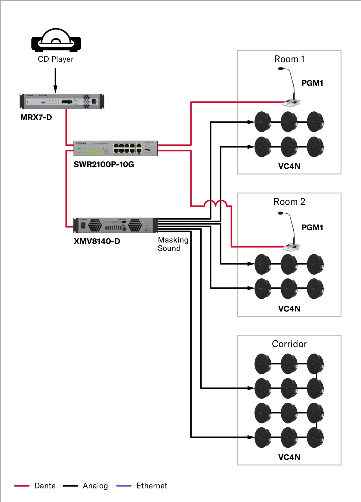 Bộ xử lý tín hiệu MRX7-D phát âm thanh che tiếng từ hệ thống bảo mật giọng nói. Loa âm trần VC4N được sử dụng để phát nhạc nền cũng như âm thanh che tiếng. VC4N là một loa nhỏ gọn, có thiết kế mỏng, mang lại chất âm tự nhiên, phù hợp cho việc phát nhạc nền.