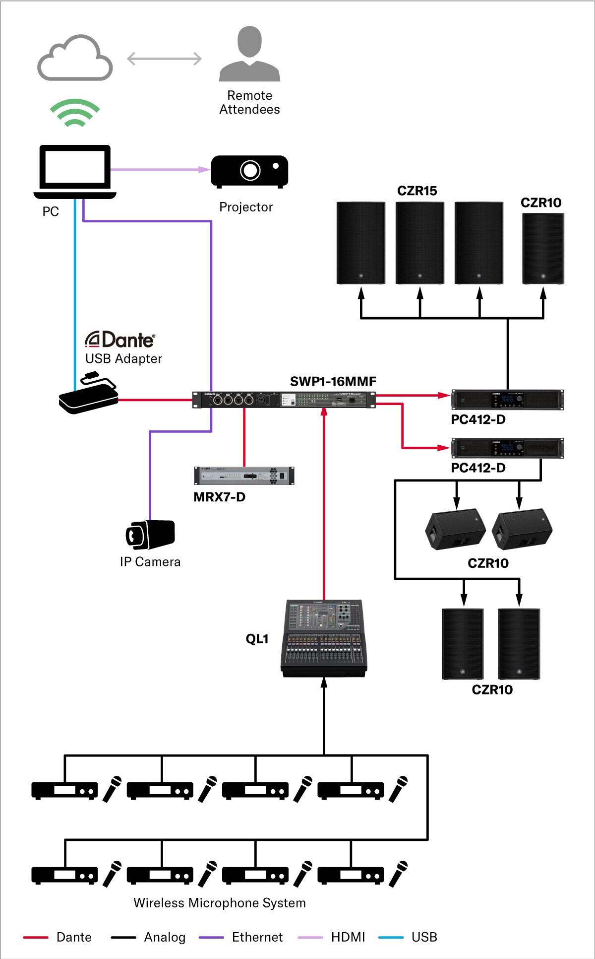 Giải pháp khác cho hệ thống PA quy mô lớn và truyền âm thanh đến khu vực từ xa. Yamaha cung cấp danh mục thiết bị hỗ trợ Dante phong phú, giúp rút ngắn thời gian thiết lập và giảm thiểu việc đi dây cho các hệ thống sử dụng bàn mixer kỹ thuật số làm trung tâm, kết hợp với nhiều loại loa point source và line array. Khi tích hợp cùng bộ điều khiển tùy chỉnh sử dụng phần mềm chuyên dụng ProVisionaire, việc thiết lập và vận hành hệ thống trở nên đơn giản hơn nhiều so với kỳ vọng, giúp dễ dàng truyền tải âm thanh rõ ràng và đồng đều đến cả sân khấu và người tham gia từ xa.