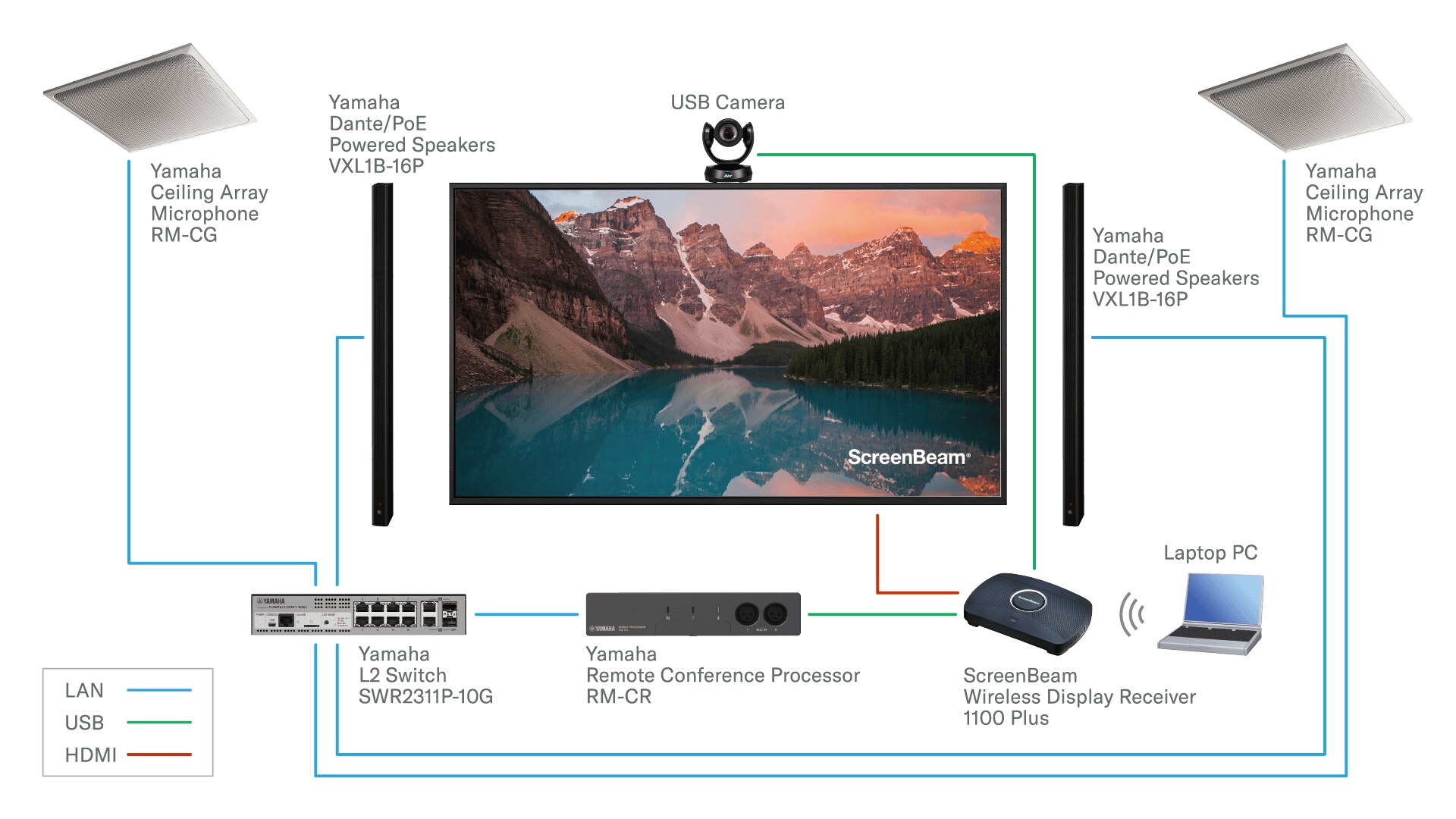 Giải pháp ADECIA của Yamaha và soundbar video CS-800, kết hợp với ScreenBeam 1100 Plus và một camera USB, mang lại trải nghiệm hội nghị video và âm thanh cao cấp cho bất kỳ môi trường học tập hoặc làm việc hỗn hợp nào nào với việc chia sẻ nội dung phong phú. Bộ thu hiển thị không dây ScreenBeam 1100 Plus, và phần mềm hội nghị ScreenBeam, cho phép kết nối không dây giữa thiết bị máy chủ và thiết bị AV kết nối qua cổng USB, kết nối này được hỗ trợ cho tất cả các nền tảng hội nghị phổ biến. Các thành viên tham gia có thể điều khiển cuộc họp từ thiết bị của họ và ngay lập tức trình bày trên màn hình trong phòng, tạo ra các cuộc họp hiệu quả và không bị gián đoạn.