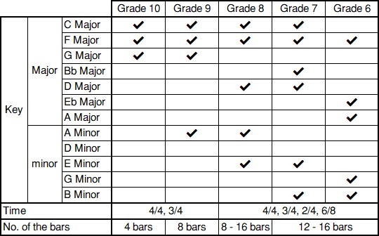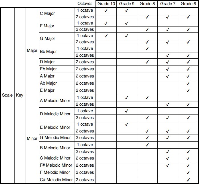 Candidates play one (Grade 10), two (Grades 9-6) scale(s) selected by the examiners without the use of a score.