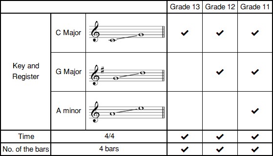 3. Giám khảo đàn nửa đầu, sau đó ứng viên đàn/hát (Grade 13), đàn (Grade 12, 11) giai điệu theo tai nghe. Giám khảo có thể đàn từng phần giai điệu ngắn hơn nếu ứng viên hát với Grade 13.