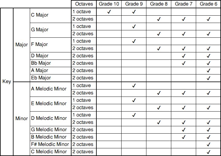 Ứng viên đàn một (Grade 10), hai (Grade 9-6) âm giai do giám khảo chọn và không nhìn bản nhạc.