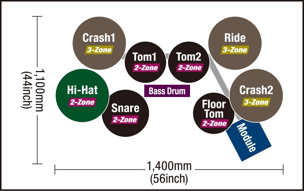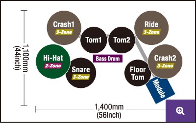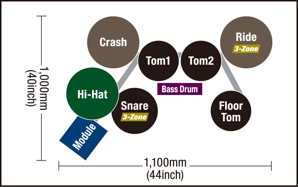 - Mặt trống 3 vùng tiếng cảm ứng cho snare và ride. Các tấm cymbal có thể đánh kỹ thuật choke hoặc câm tiếng. Tấm cymbal ride có chức năng nhận diện điểm đánh