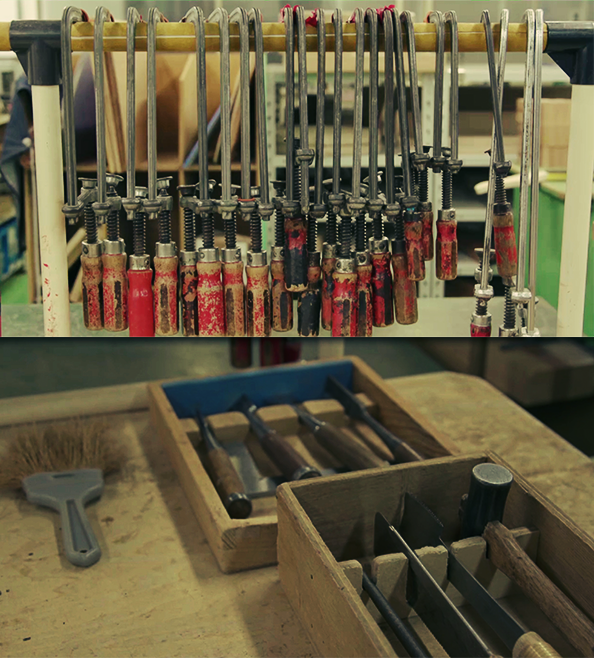 Hầu hết các công cụ dùng để làm đàn guitar phải được chế tạo bằng tay cho từng mục đích, và nhiều công cụ được tạo riêng cho một kiểu đàn duy nhất, không thể sử dụng cho các kiểu đàn khác. Việc phát triển các công cụ và đồ gắn lắp đặc thù giúp các nhà sản xuất đàn guitar dễ dàng tạo ra các nhạc cụ hoàn hảo là một yếu tố quan trọng trong việc tiếp cận các ngành nghề thủ công của Yamaha, nhưng các công cụ và đồ gắn lắp có thể bị mòn và không còn phù hợp cho việc sử dụng, vì vậy cần phải có sự chăm sóc đặc biệt để duy trì các công cụ này luôn ở trong điều kiện làm việc hoàn hảo: đây là phần việc không thể hiện ra ngoài nhưng rất quan trọng trong hoạt động kiểm soát chất lượng tổng thể.