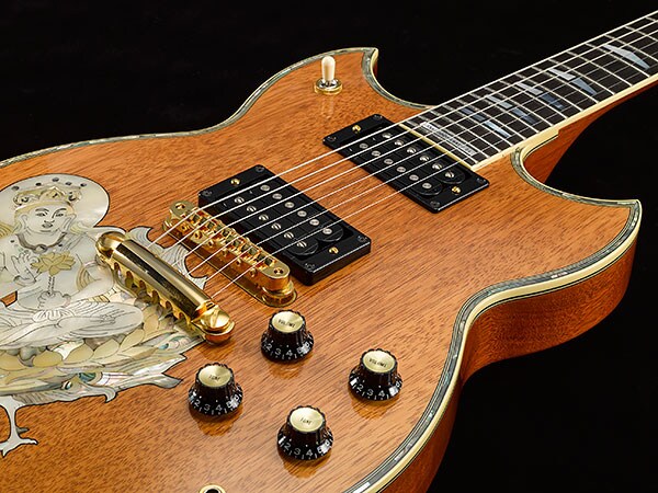 The SG175, designed and developed specifically for Carlos Santana, was dubbed the "Buddha SG." The distinctive body inlay work featuring a Buddha image that was intended to convey the high quality of Japanese products to the world. The model shown commemorated 30 years of Yamaha electric guitars in 1995 and was issued and sold in Japan only.