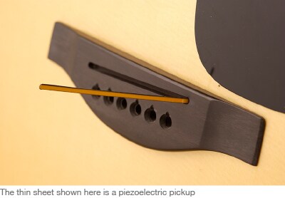 A piezoelectric pickup is a device that converts the vibrations of the instrument itself into electrical signals. It resembles a thin sheet of film. These pickups are often placed below the saddle. Although they are structured to prevent howling, they produce a sharp and slightly quirky sound compared to the sound generated by a microphone. Yamaha offers several options designed to produce better sound, such as piezoelectric pickups integrated into the saddle that produce a sound with a nuanced tone that is closer to the original sound of the guitar, and devices that include mechanisms to control the sound produced in environments such as the studio.