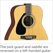 There are some left-handed players who play on normal guitars-they simply wear the instrument "upside-down." Such players need to learn to press the strings in reverse order. While this is certainly impressive, there are actually guitars designed for left-handed players. The first difference is that the position of the pick guard reversed. The orientation of the saddle that supports the strings is also reversed. The bracing inside the body is reversed so that sound resonates well.