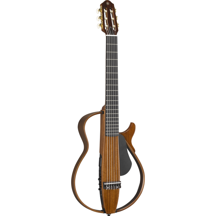 The nylon-string SILENT Guitar SLG200NW features a traditional classical guitar neck and nut width, an ebony fingerboard, and elegant gold tuner baseplates.