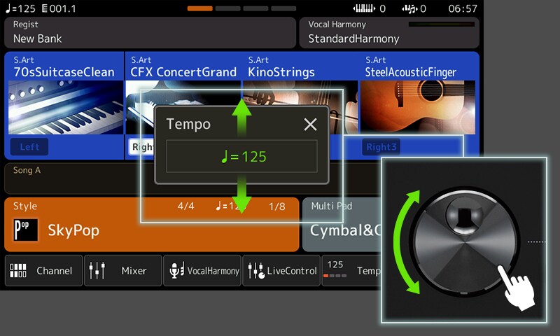 Trong Màn hình chính, Nhịp độ được gán làm mặc định cho Nút xoay Dữ liệu, thực hiện điều chỉnh nhịp độ nhanh chóng và dễ dàng.