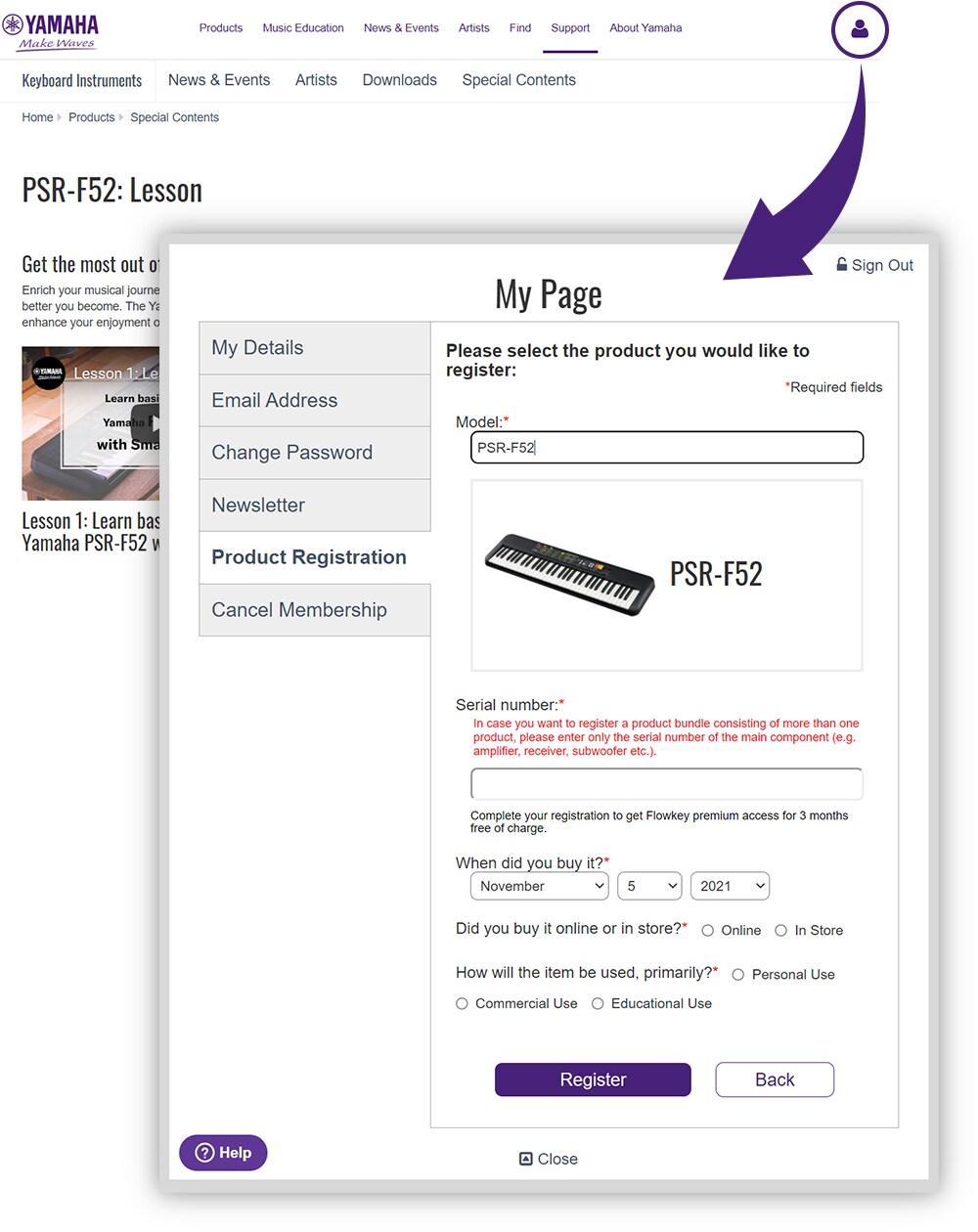 Chúng tôi sẽ gửi một loạt email cho những người đã đăng ký PSR-F52 của mình. Những email này sẽ có đường dẫn đến các video bài học hướng dẫn bạn cách chơi các bài hát trong Sách nhạc bằng chức năng Smart Chord. Vui lòng kiểm tra thông báo sau trước khi đăng ký. ※Chúng tôi dự định gửi video bài học đầu tiên vào cuối năm 2021 hoặc đầu năm 2022.