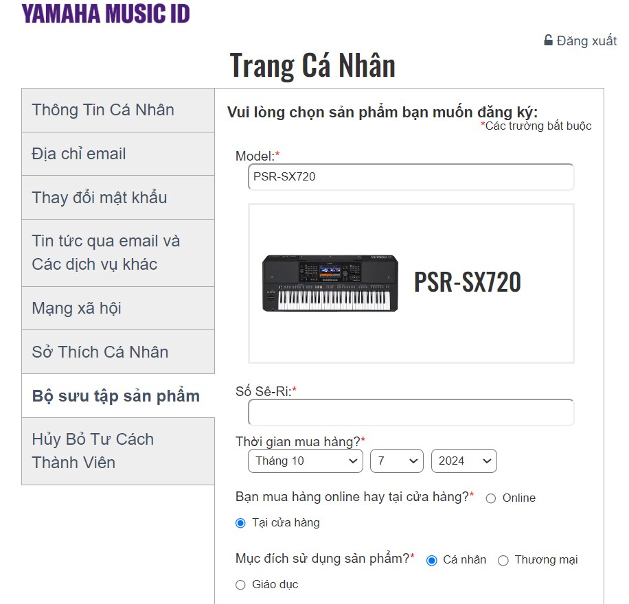 Vui lòng chọn mục “Bộ sưu tập sản phẩm”, bấm chọn nút “Đăng ký sản phẩm”, Nhấp vào nút “Đăng ký sản phẩm mới” và bắt đầu nhập tên sản phẩm PSR-SX720 hoặc PSR-SX920 của bạn và các thông tin bắt buộc khác. Nếu bạn gặp vấn đề trong việc tìm kiếm sản phẩm của mình, vui lòng liên hệ với chúng tôi.