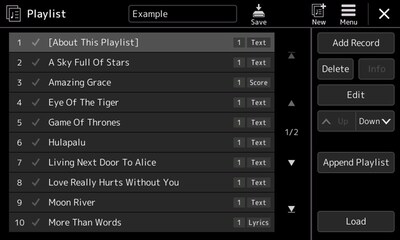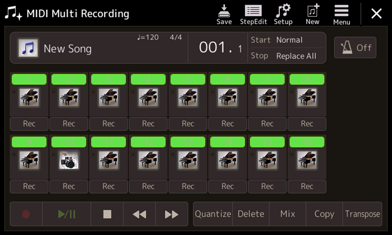 Ghi lại nhanh những màn trình diễn của bạn dưới dạng âm thanh (WAV) hoặc Tệp MIDI chuẩn (SMF) bằng tính năng Ghi âm nhanh. Đối với các sắp xếp phức tạp hơn, chức năng ghi nhiều bản (Multi Record) sẽ phát tuần tự MIDI 16 rãnh đầy đủ chức năng với chức năng thời gian thực và bước đếm.