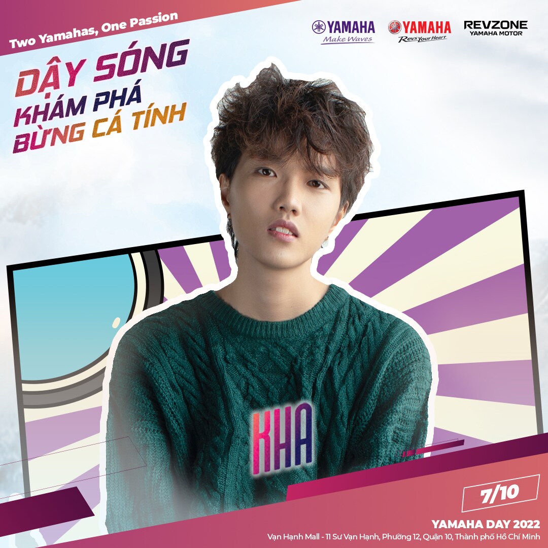 Được yêu thích thông qua 02 bài tình ca: “Lời yêu ngây dại” và “Em có nghe”, KHA chính là một phần cá tính và Yamaha Việt Nam muốn hướng tới: bên cạnh những bản sắc nổi trội và cá tính bùng nổ, những sự nhẹ nhàng và tâm hồn nhiều tự sự của bạn trẻ cũng là những khía cạnh mang nhiều màu sắc. Đón chờ màn trình diễn của KHA tại sự kiện ngày 07/10/2022 nhé!