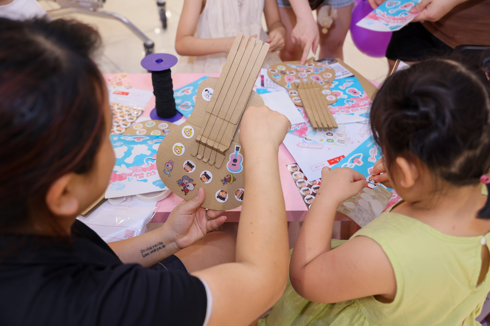 Bên cạnh khu trải nghiệm nhạc cụ, Workshop Make & Play tại tầng 3 đã tạo nên một không gian sáng tạo lý tưởng cho các bạn nhỏ. Các bé được trực tiếp lắp ráp những nhạc cụ mini như trống, guitar và tự tay trang trí sản phẩm bằng sticker đầy màu sắc. Không chỉ rèn luyện sự khéo léo, hoạt động còn giúp các bé khơi gợi niềm yêu thích âm nhạc từ những trải nghiệm đầu tiên.