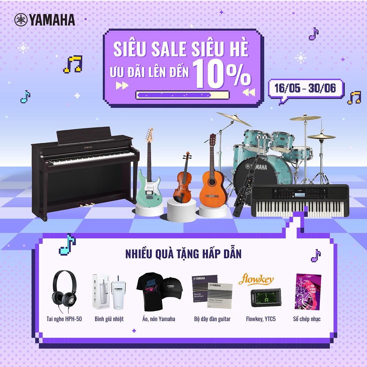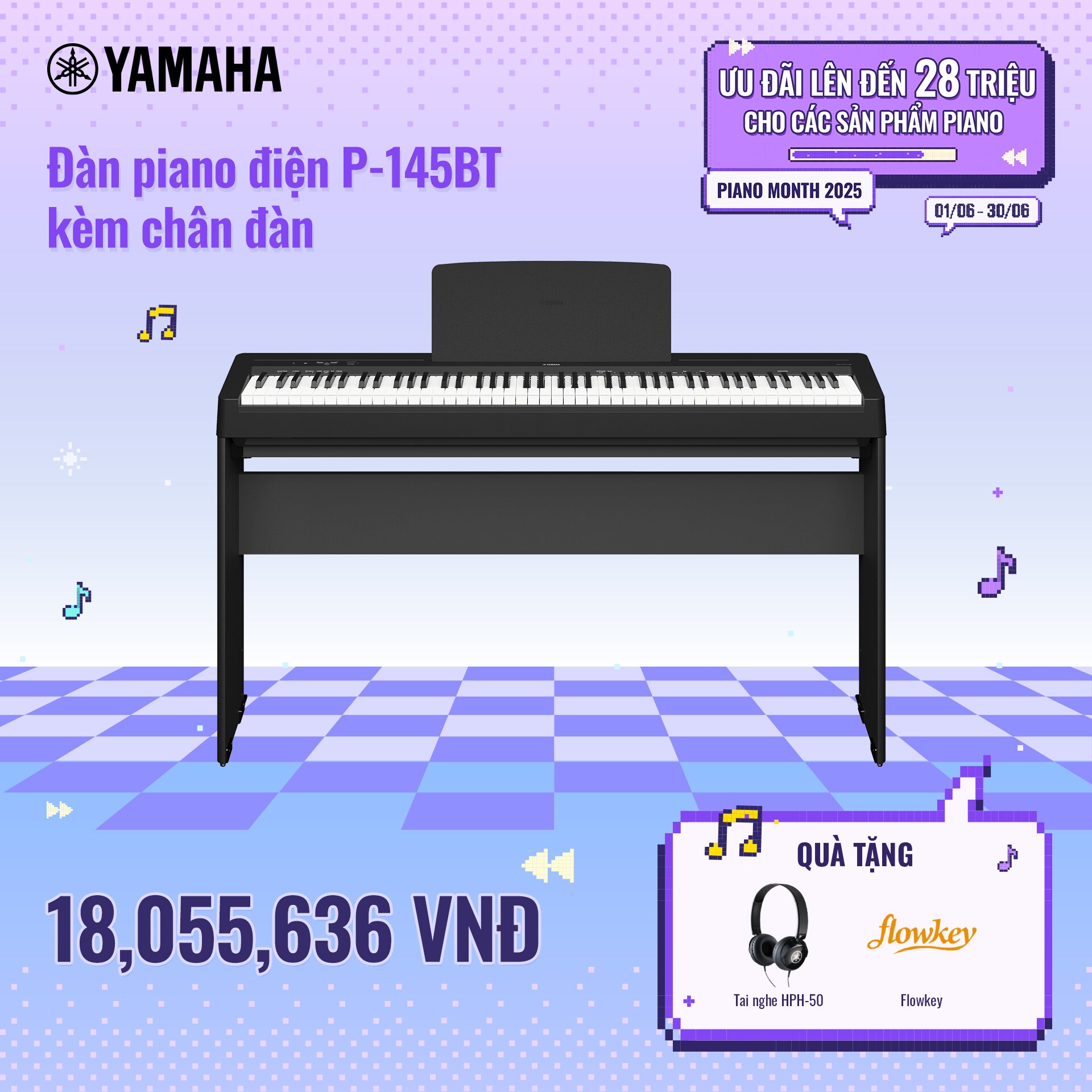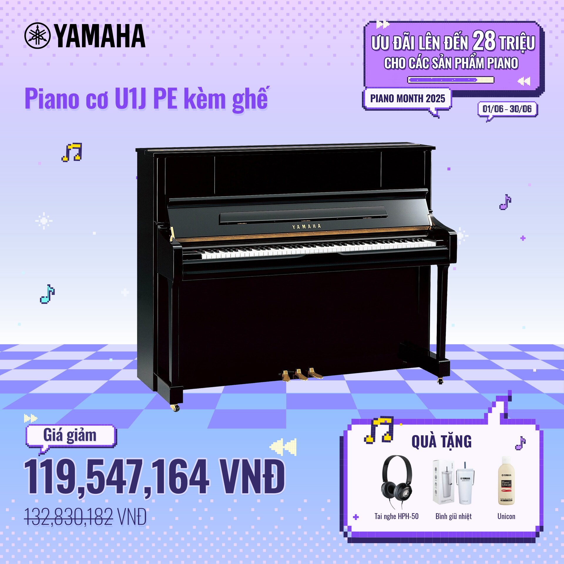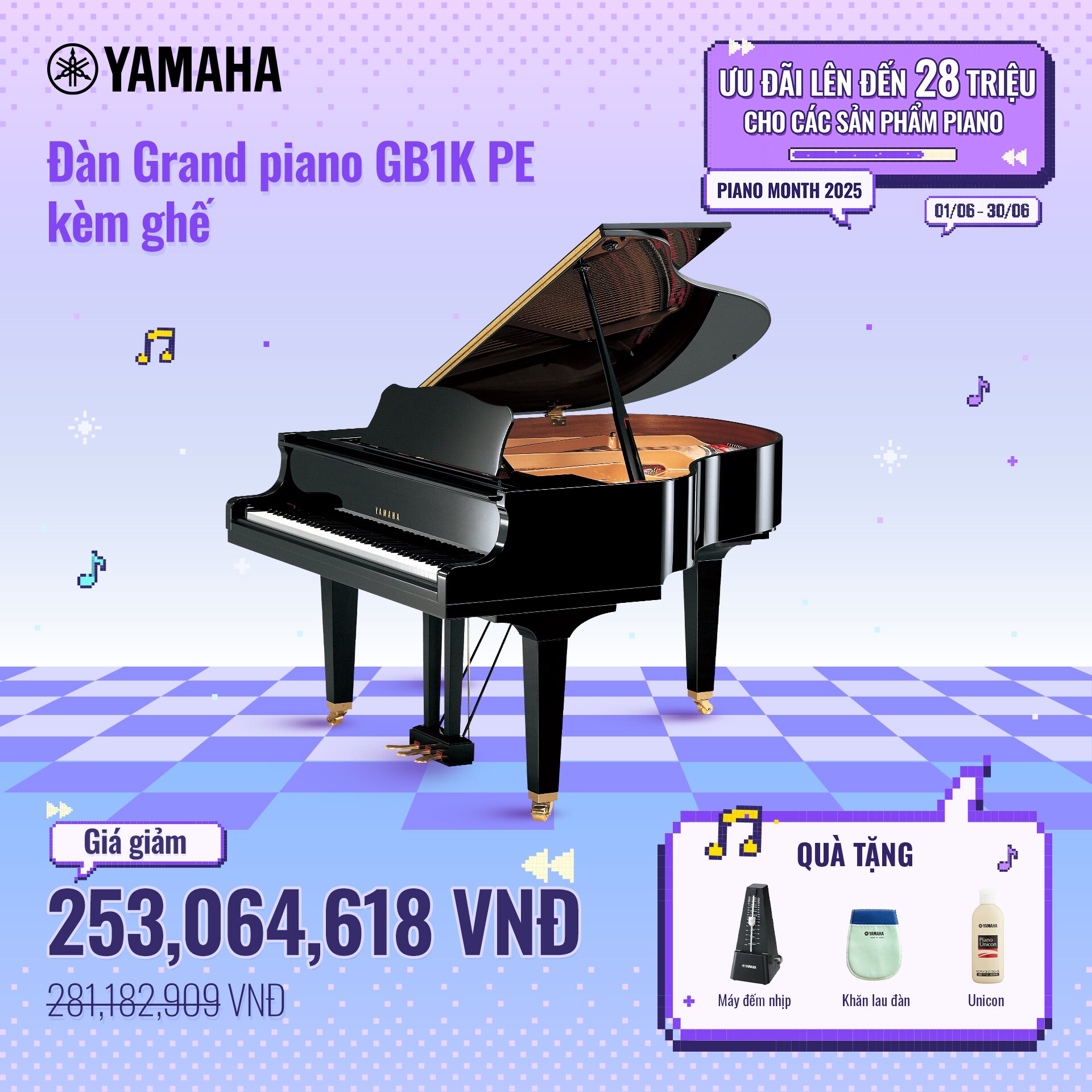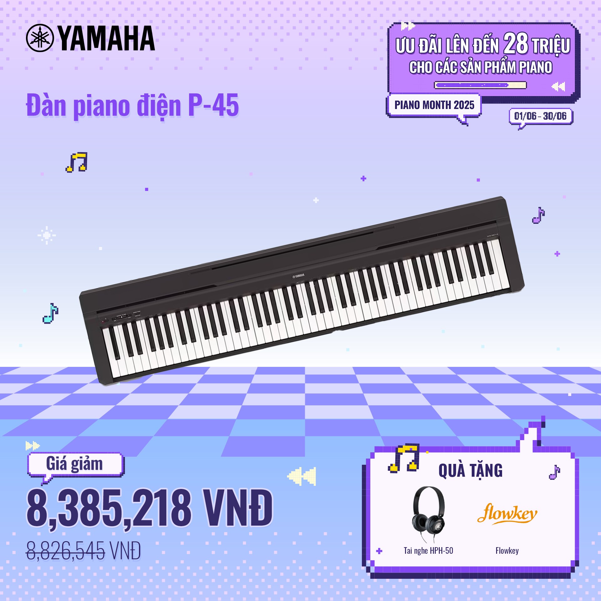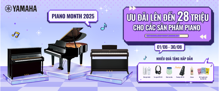 Chương trình khuyến mãi tháng Piano tiếp tục trở lại trong mùa hè này! Khách hàng sẽ được tận hưởng mức giá hấp dẫn cùng nhiều quà tặng giá trị khi sở hữu các sản phẩm đàn piano nổi bật như YDP-165, P-45, U1J và nhiều dòng đàn khác. Đừng bỏ lỡ cơ hội tuyệt vời này để đầu tư vào niềm đam mê âm nhạc của bạn!