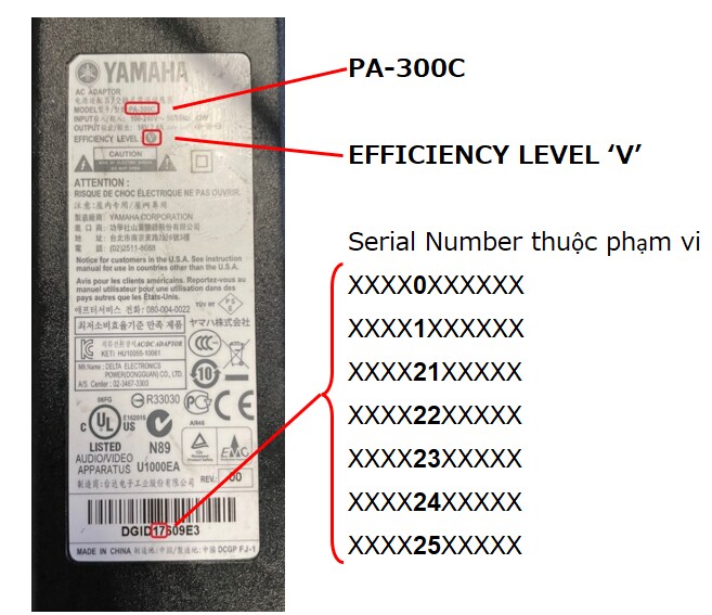 Vì sự an toàn của người tiêu dùng, Yamaha sẽ thu hồi và thay thế hoàn toàn miễn phí các adapter PA-300C thuộc diện ảnh hưởng.